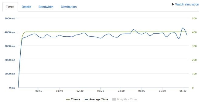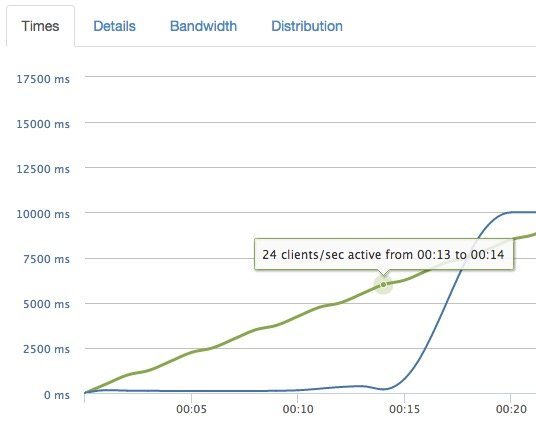 在运行负载增加测试并调整资源限制之后,下一步就开始进行负载不变测试。负载不变测试会在一段很长的时间内(至少 10 分钟,时间再长一点更好)对应用施加相同的负载,至于加多少负载,最好选择在图像出现断点之前的压力值(例如:客户端数量)。