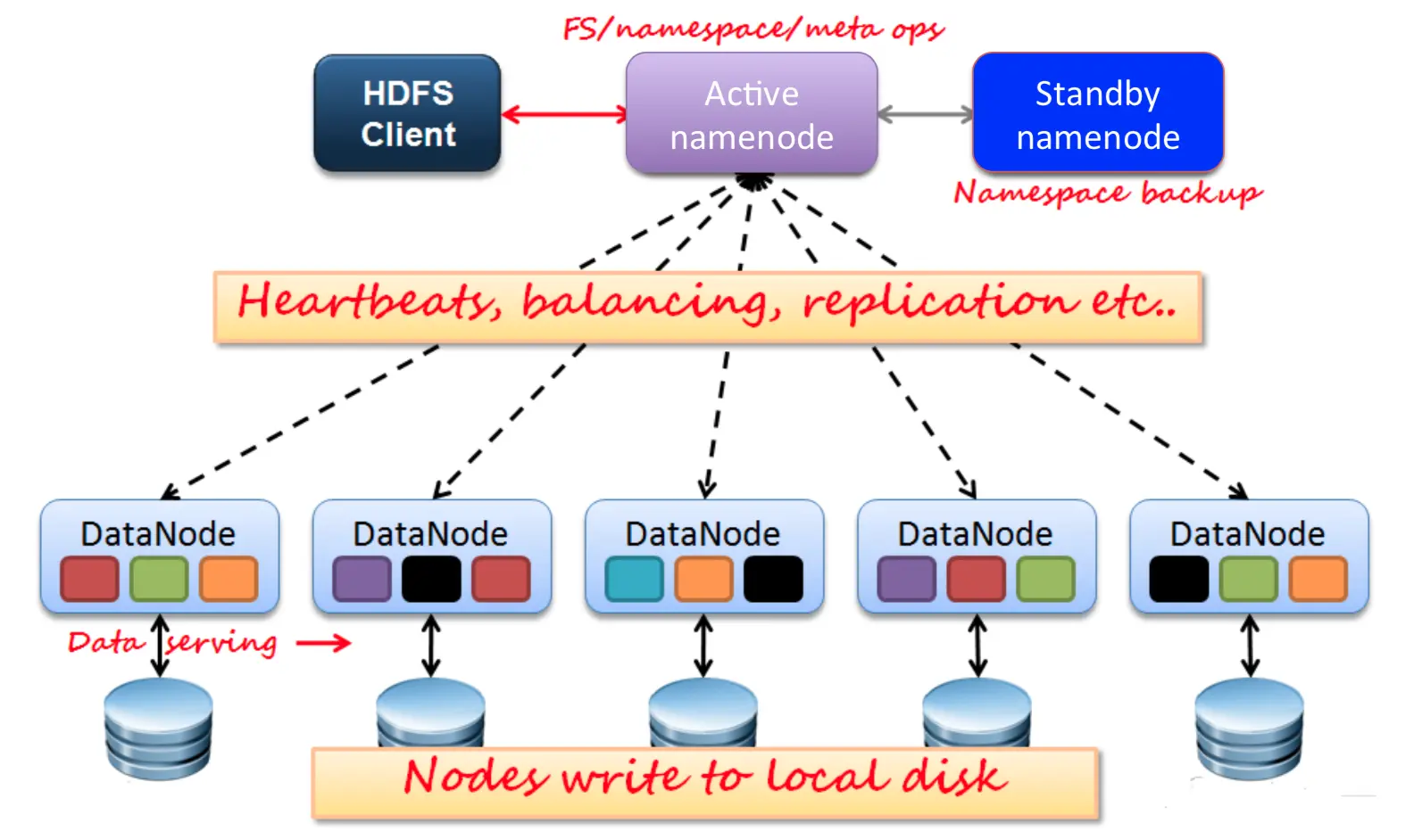 HDFS的基本原理是将文件切分成等大的数据块(block,默认128MB),存储到多台机器上,这是一个容量巨大、具有高容错性的磁盘。通常的架构是一个NameNode(存放元数据)多个DataNode,为了防止namenode宕机,有一个备用的NameNode:Standby NameNode。