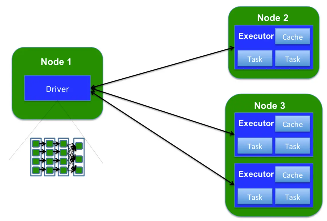 我们来分析下一个spark程序的架构,每一个程序的main函数运行起来都由两类组件构成:Driver和Executor,main函数运行在Driver中,一个Driver可以转化为多个Task,每个Task都可被调度运行在指定的Executor中。