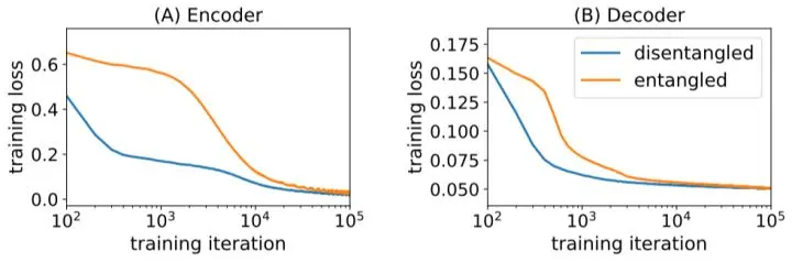 经过实验,关键还是在于 DCNN + SGD 过程。在编码 disentangle 的情况下,E 和 G 网络都训练更快(因为对于 DCNN 而言,这样的任务“更简单”)。所以梯度下降时网络会倾向于走这个最快的道路。