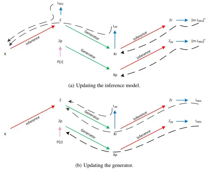 思想是,在原有 VAE 的基础上,要求 E 网络在输入假图像【包括 G(z) 和 G(E(x))】时,给出和 分布尽量不同的编码(增大此时