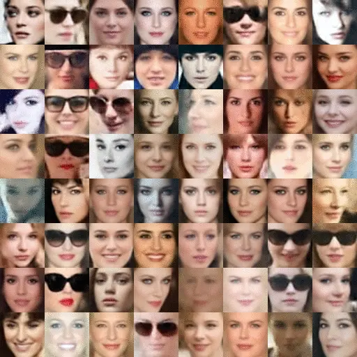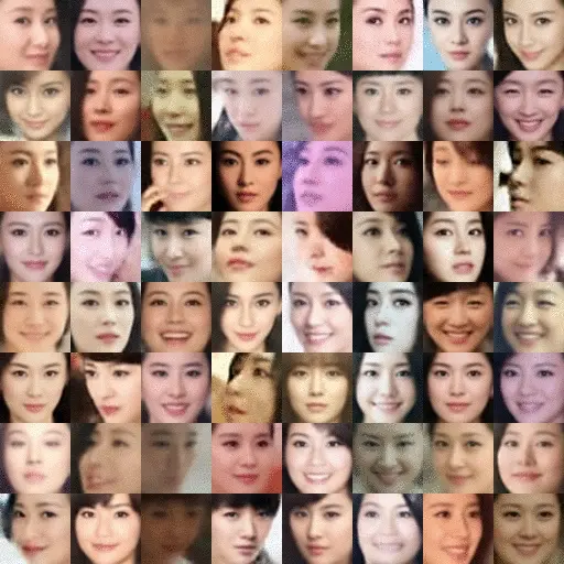 效果如下图,和 nVidia 的 PGGAN 相当,而且不需要分层训练,可以直接训练: