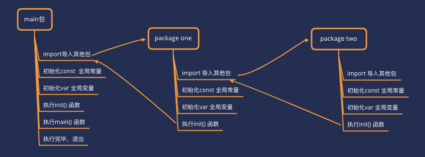 import 导入包的过程 程序的初始化和执行都从main包开始,如果,mian包还导入了其他的包,那么在main包中,会先导入其他的包(其余包也一样),然后再将包的全局常量和变量进行初始化,接着在执行init()函数,最后在执行main函数。在导入的其余包中,重复导入包、初始化常量、变量、执行init操作。