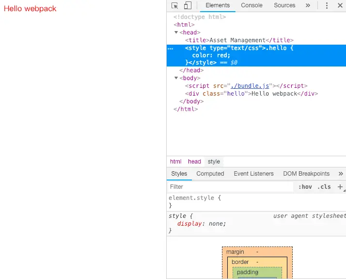 此时用浏览器打开index.html,会发现之前的Hello webpack变成了红色。请注意,之前我们并没有在index.html中引入任何的css样式。用浏览器检查一下页面,就会知道webpack是怎么做到的了。