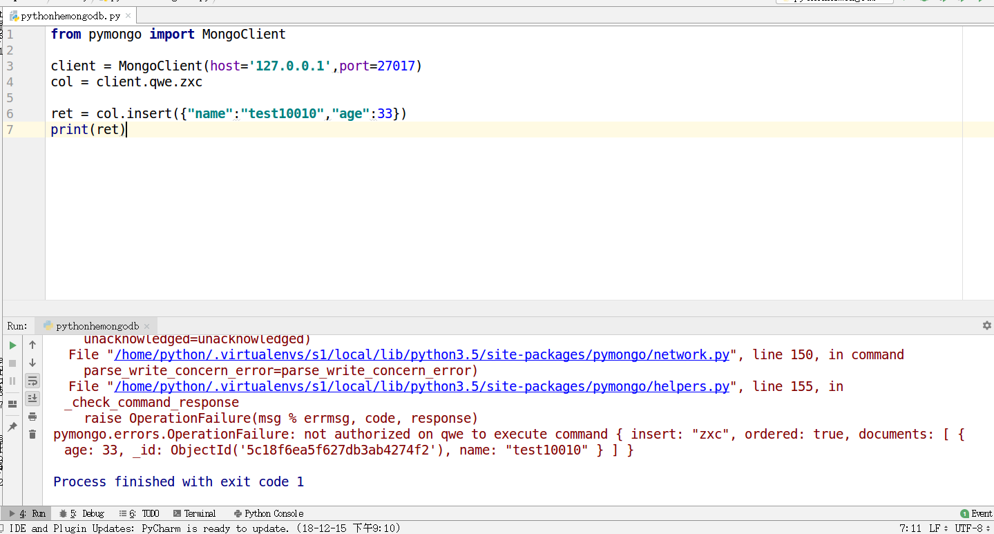 pymongo.errors.OperationFailure: not authorized on test to execute command