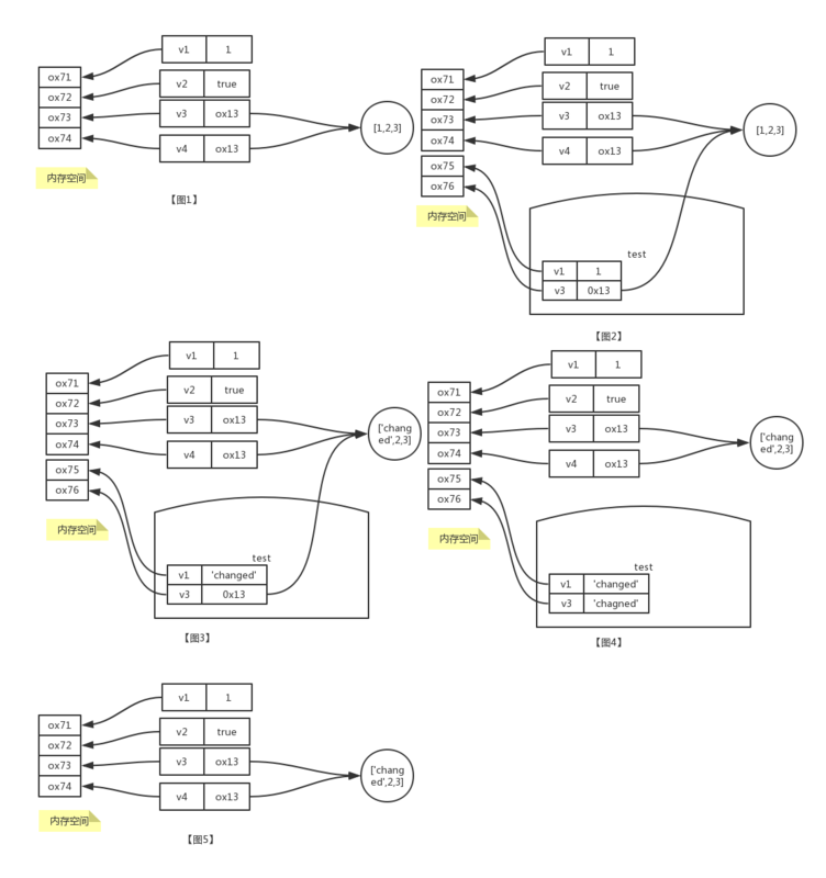 - 图3 内层的v1的值被改变成'changed‘, v3[0]的值被改变为'changed'。