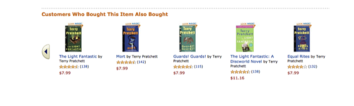 推荐引擎是我们熟悉的基于精心构建的但不能实现最佳目标的预测模型数据产品。当前的算法根据购买历史和类似客户的历史来预测客户会喜欢哪些产品。以亚马逊为例,每一次购买可以看作为一个巨型稀疏矩阵,其中客户作为行,产品作为列。一旦他们拥有这种格式的数据,数据科学家就会采用某种形式的协同过滤来“填充矩阵”。例如,如果客户A购买产品1和10,而客户B购买产品1,2,4和10,引擎会推荐A买2和4。这些型号擅长预测客户是否会喜欢某个特定产品,但他们经常推荐客户已经知道或已经决定不购买的产品。亚马逊的推荐引擎可能是最好的推荐引擎,但是它的弊端也很容易显现。下面是一张“购买此物品的客户也购买了哪些产品”的截图,这些客户搜索了Terry Pratchett的“Discworld系列”。