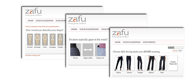 我们需要收集哪些新数据?这可能因具体情况而定,但一些在线零售商正采取创造性的方法来完成这一步骤。在线时装零售商Zafu给我们展示了它是如何鼓励客户参与到此过程的。很多网站都出售设计师的作品,但对于很多女性来说,高端牛仔裤是他们不会在线上购买的一件商品,因为如果不试穿的话,很难找到合适的牛仔裤。Zafu的方法不是直接将衣服展示给顾客,而是先询问一系列关于顾客体型、其他牛仔裤的合身程度以及时尚偏好的简单问题。只有这样,客户才能继续浏览Zafu网站。数据收集和建议步骤不是附加组件;他们是Zafu的整个商业模式 - 女式牛仔裤现在是一种数据产品。 Zafu可以根据他们的系统收集到的数据来不断改良他们的牛仔裤设计。