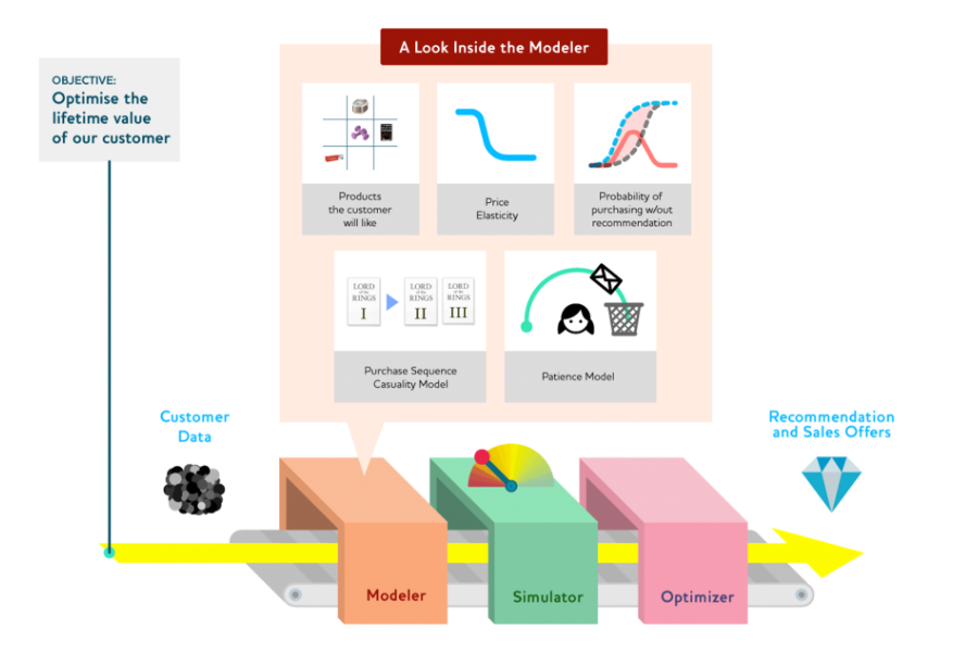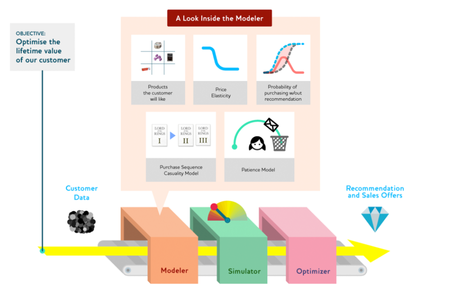 一旦我们拥有这些模型,我们就构建了一个模拟器和一个优化器,并在组合模型上运行它们,以找出哪些建议将实现我们的目标:推动销售并改善客户体验。