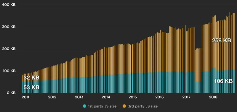 - 对 HTTP Archive 数据源的分析可以发现,2011 年至 2018 年,第一方 JavaScript 代码增长了1倍,第三方 JavaScript 代码增长了 7 倍。🔗