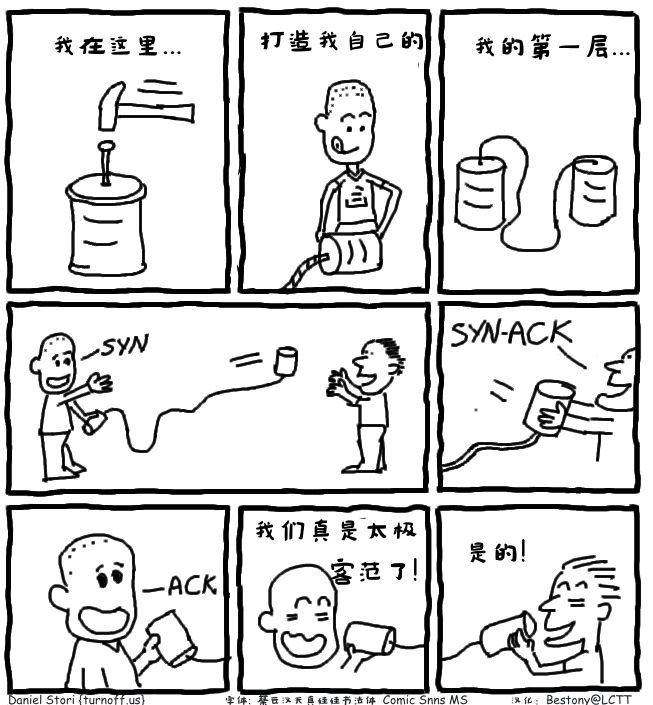 这幅漫画展示了 TCP 协议的沟通过程。首先是构建一个层(TCP 工作于传输层),然后向要通信的人发送建立联系的信号(SYN),接受到信息的人回复确认信息(ACK),确认已经收到,同时,发送建立联系的信息(SYN),这时,它发送的信息就是(SYN-ACK),当最初发送信息的人收到信息后,再回复了确认信息(ACK)。在回复了确认信息后,他们可以正常的交流,就开始说话了。