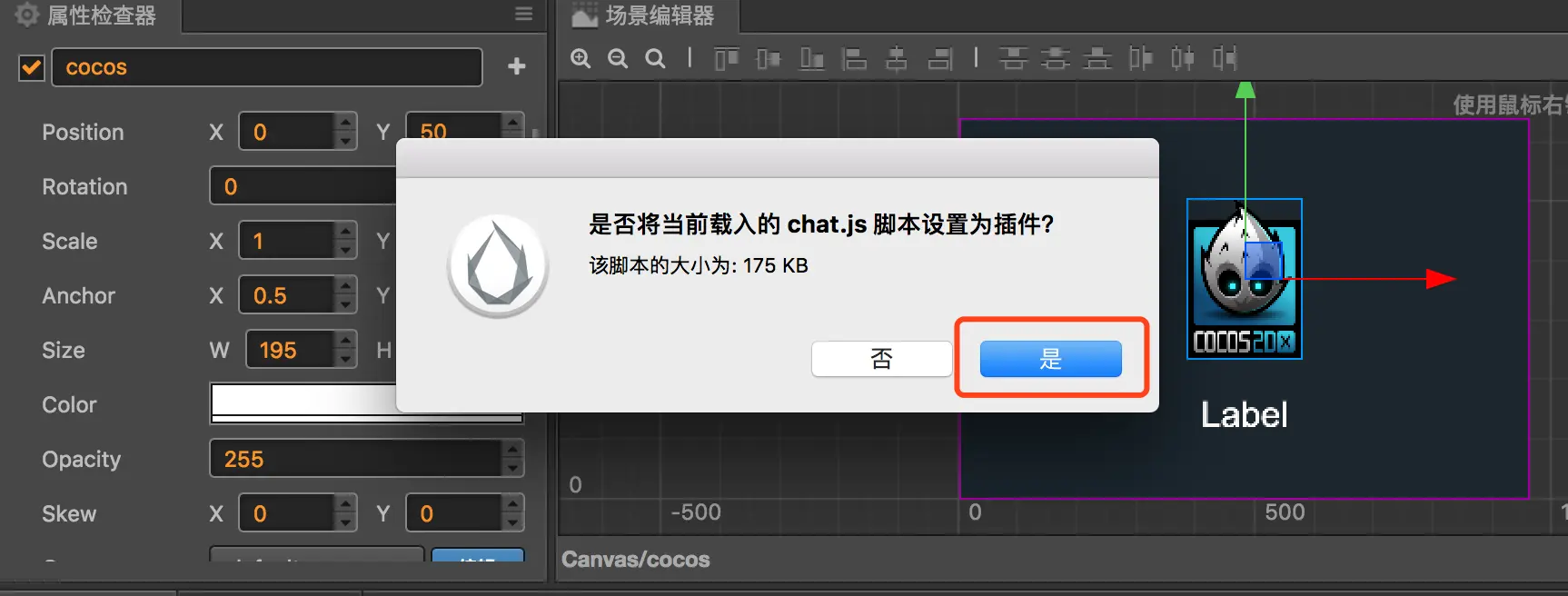 将5.2中编译生成的JS导入到工程的脚本文件夹中,打开Cocos Creator就会提示您是否要将脚本设置为插件。