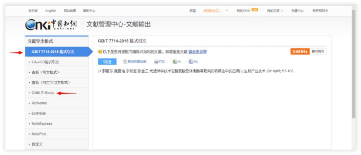 选择适合的文献格式导出。图中第一个箭头所指的是比较常用国标格式。第二个箭头所指的是 E-Study 软件专属的格式,文件后缀为eln。