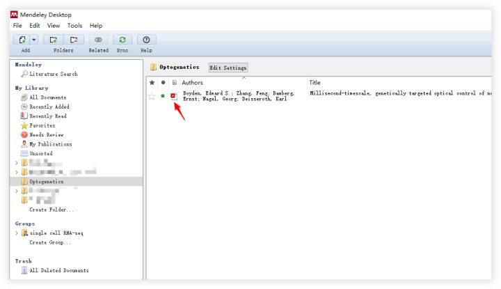 通过添加全文的方式导入的文献会关联本地的 PDF 文件,点击箭头所指图标,可直接打开对应的文件。