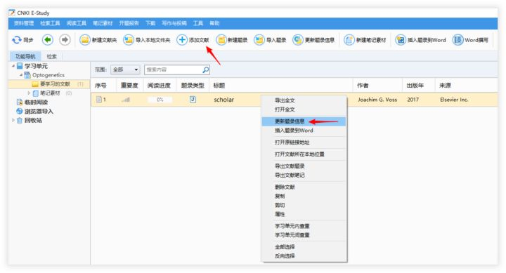 由于软件识别信息不完整(图示标题未能识别成功),可通过鼠标右键点击选中的条目,选择「更新题录信息」让软件从互联网中抓取匹配的条目信息。