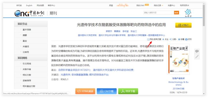 输入关键字(如题目)进行文献查找,可点击含 PDF 关键字的链接下载文献全文,也可以点击"图标选择复制或下载相应格式的引文条目。