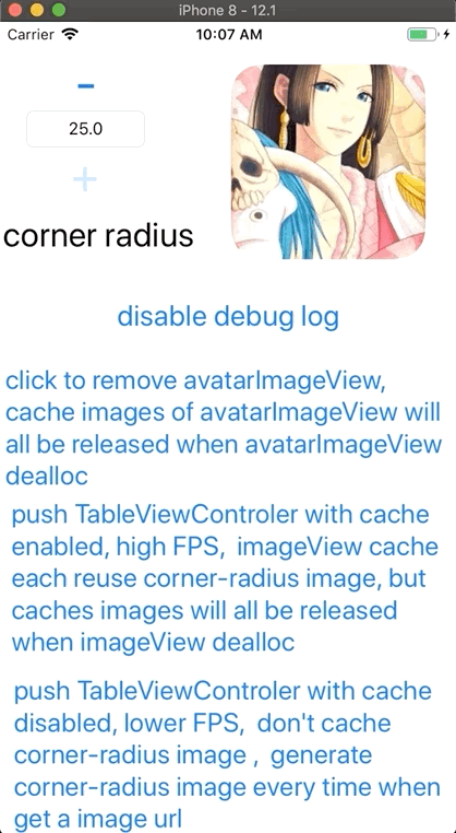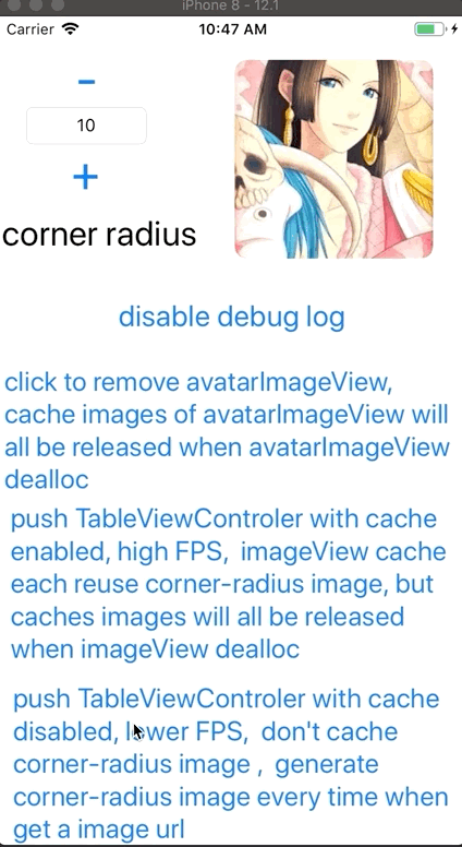 imgView.mxDisableRoundImageCache = NO, 默认是NO,缓存图片,高 FPS | imgView.mxDisableRoundImageCache = YES, 不缓存图片 |