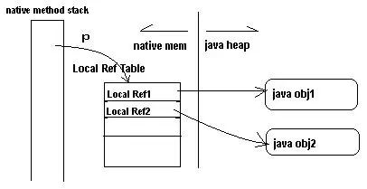 实际上,每当线程从Java环境切换到Native代码环境时,JVM 会分配一块内存用于创建一个Local Reference Table,这个Table用来存放本次Native Method 执行中创建的所有Local Reference。每当在 Native代码中引用到一个Java对象时,JVM 就会在这个Table中创建一个Local Reference。比如,我们调用 NewStringUTF() 在 Java Heap 中创建一个 String 对象后,在 Local Reference Table 中就会相应新增一个 Local Reference。
