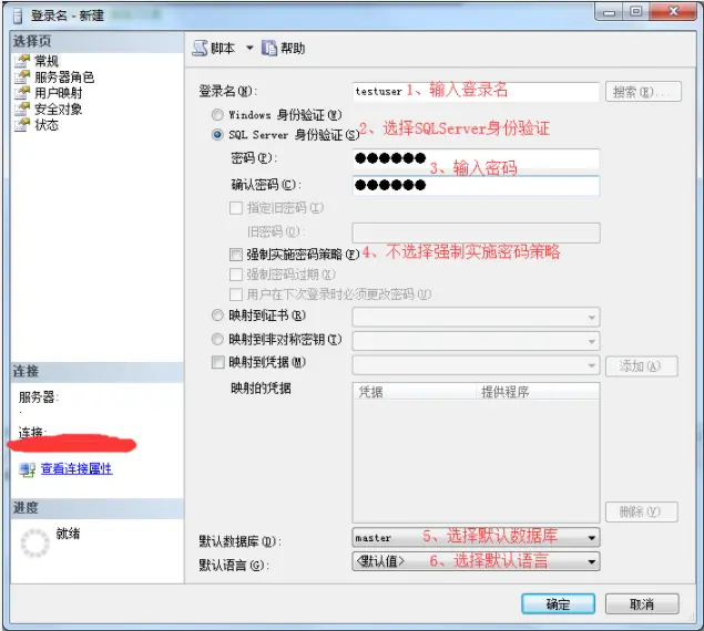 2、在登录名-新建弹出框-》点击常规-》输入登录名-》选择sqlserver身份验证-》输入密码-》选择不强制实施密码过期策略-》选择默认数据库-》选择默认语言。