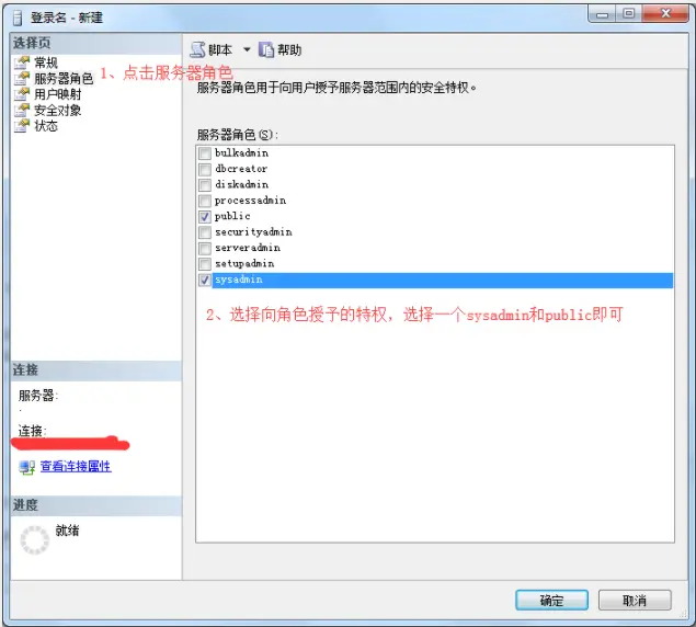 3、在登录名-新建弹出框-》点击服务器角色-》选择要向角色授予的安全特权。
