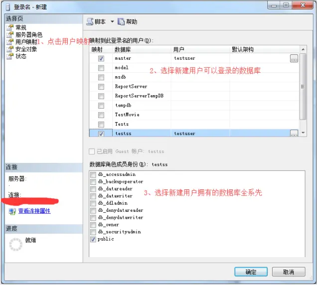 4、在登录名-新建弹出框-》点击用户映射-》选择用户可以登录的数据库-》选择用户拥有的登录数据库的权限。