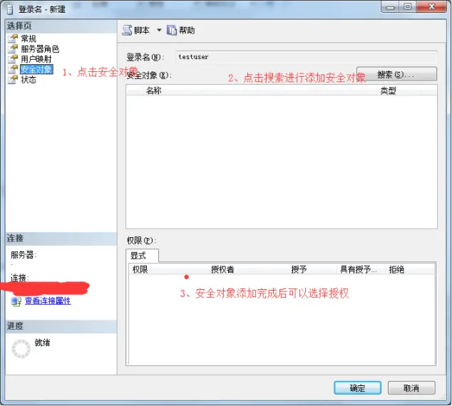 5、在登录名-新建弹出框-》点击安全对象-》点击搜索添加安全对象-》安全对象添加完成后选择安全对象权限。