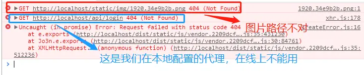 - 上图的报错信息图片报404是楼主的项目login页面的一张图片,在这里做演示。我们可以在控制台中看到,图片路径,和接口都不对。
