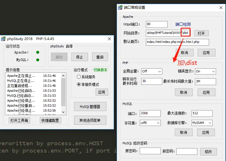 - 楼主这里修改的就比较简单粗暴了,我们在“图片一中”直接在phpstudy中的“其他选项菜单”中,选择“phpStudy设置”中的“端口常规设置”中的“网站目录”中加了一个 dist,这样就解决这个问题了,(ps:这里只做模拟演示,碰到这种情况我们就会去针对处理,而不是摸不着头脑)
