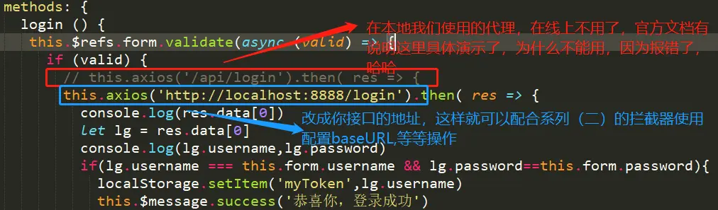 - 我们在“图片二”中,不使用本地代理,因为官方文档中proxyTable{},只在开发环境中可以用,这时候我们直接换成我们全部的接口地址,这样解决了这个问题,就可以正常登陆了。同时,我们在main.js中可以配置axios的拦截器,简化我们写这么长的url地址。(详情见系列一,二)这里“贴一段代码示例”