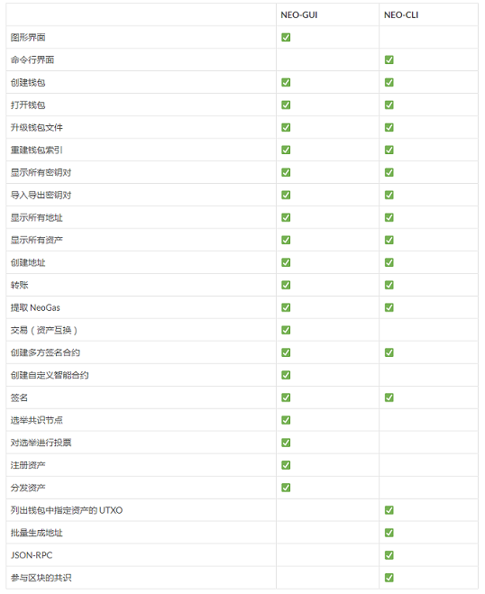 - NEO-CLI: 面向开发者,提供命令行界面,具有一些钱包操作的基本功能,除此之外还会对外提供 API,可以与其它节点达成共识,参与区块的生成。