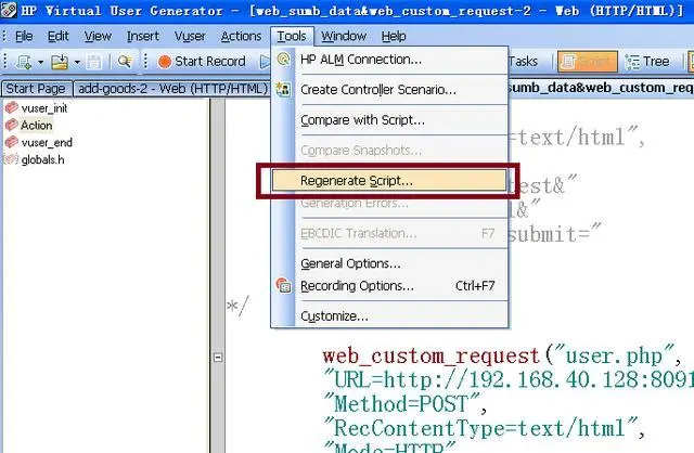 对于使用HTML方式录制好的脚本也可以通过重新生成脚本的方式,将脚本变成以自定义请求函数提交请求的脚本。其步骤如下: