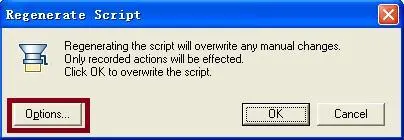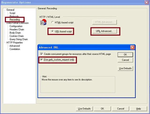 在弹出的Regenerate Options对话框中,选择Recording选项,然后再选择URL-based script选项,单击“URL Advanced”。