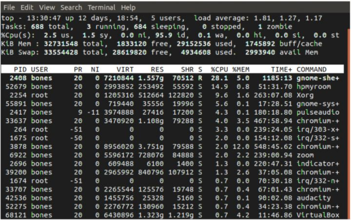 大多数人都希望得到一个进程列表,因为他们想要停止占用过多内存或 CPU 时间的进程。这种情况下有两个非常简单的命令,分别是 top 和 htop 命令(图 5)。