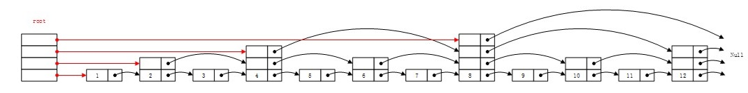 假设查找元素el,应该从最高层上的指针开始,找到该元素就成功的结束查找。如果到达该链表的末尾,或者遇到大于元素el的某个元素key,就从包含key的那个节点的前一个节点重新开始查找,但是这次查找是从比前面低一层的指针开始的。直到找到el,或者沿着第一层的指针到达链表的末尾,或者找到一个大于el的元素,查找才会停止。