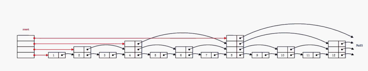 这意味着第2个节点指向前面距离2个单位的节点,第4个节点指向前面距离4个单位的节点,以此类推。为此,要在链表中包含不同数目的指针:半数节点只有一个指针,1/4节点有两个指针,1/8节点有3个指针,以此类推。