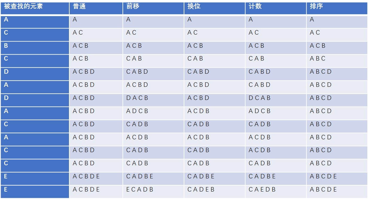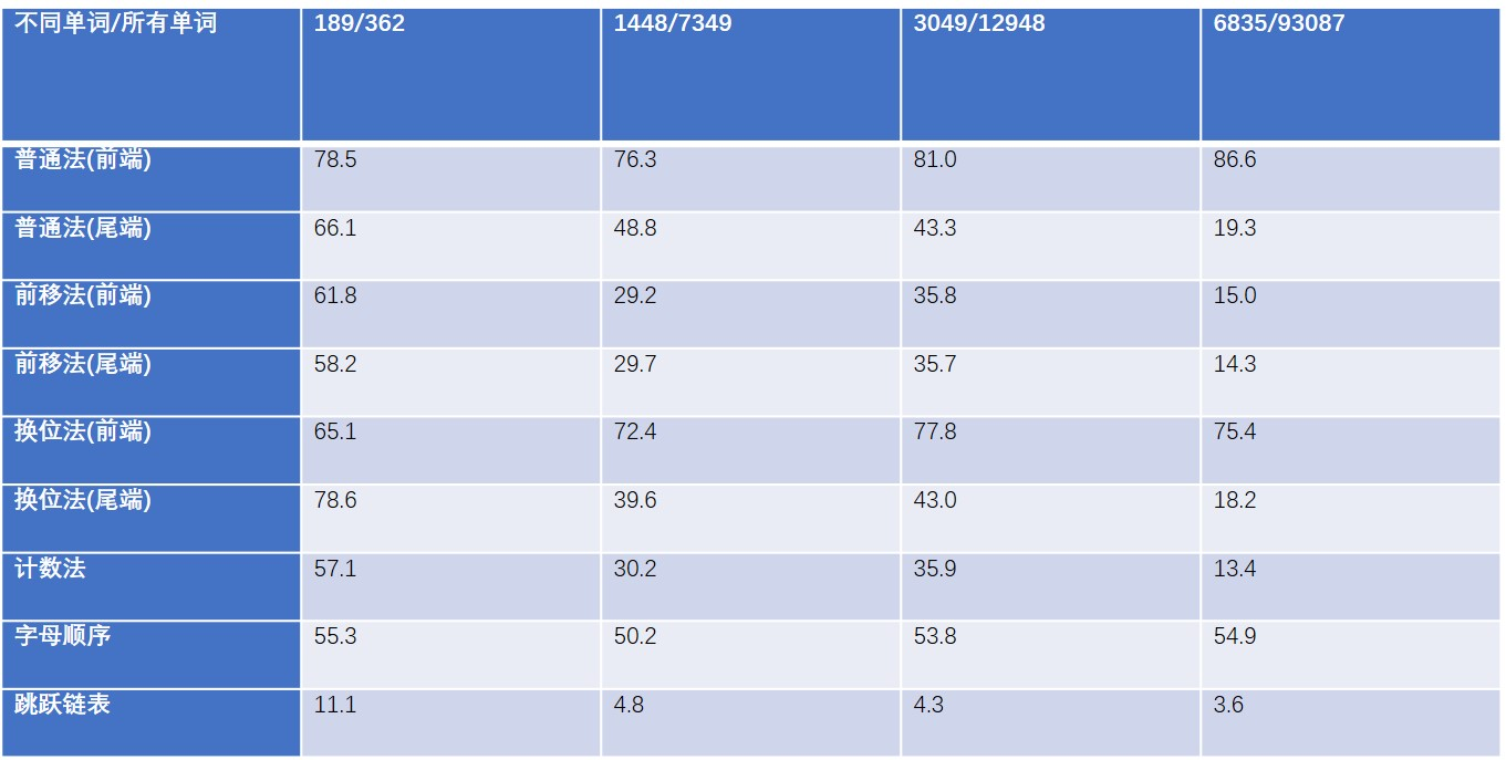 可以看到跳跃链表的查询效率相比于其他方法有着巨大的优势,紧随其后的是计数法,然后是前移法以及换位法都比字母顺序以及普通法表现优异。