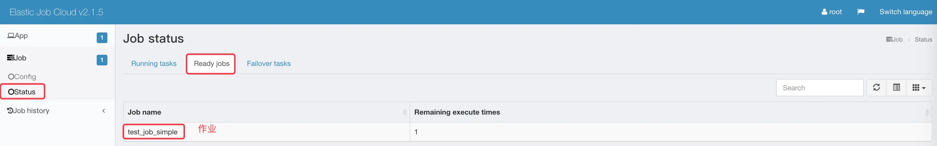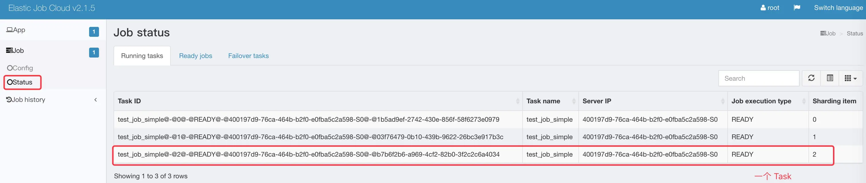/${NAMESPACE}/state/ready/${JOB_NAME},存储值为待执行次数。例如此处,待执行次数为1。使用 zkClient 查看如下:[zk: localhost:2181(CONNECTED) 4] ls /elastic-job-cloud/state/ready [test_job_simple] [zk: localhost:2181(CONNECTED) 5] get /elastic-job-cloud/state/ready/test_job_simple 1 -
