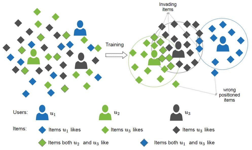 度量学习(从近期的工作Collaborative Metric Learning推广开来)已经展现了解决这个问题的能力。然而,也存在一些问题:向量空间的过度拥塞。尽管该算法会学习相似的集群,我们假设学到的集群也可能会遇到过度拥塞的问题,从而导致次佳的结果。