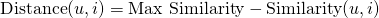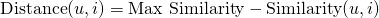 Max Similarity可能是评分的最大值(例如,5)或者隐式反馈的最大值(例如,1)。通过这样的翻转操作,可以在保持其分布的同时,将偏好(相似性)转化为距离。这个转化可以同时应用于显式和隐式的反馈。距离是两个对象之间分开多远的数值度量。距离函数应该满足四个严格的条件:1、非负性,2、不可分的同一性,3、对称性,4、三角不等式。在不同的应用领域有着很多不同的距离函数,例如:离散距离,欧式距离以及图距离等。在欧式空间 中,两点之间的距离通常是通过欧式距离(或