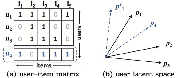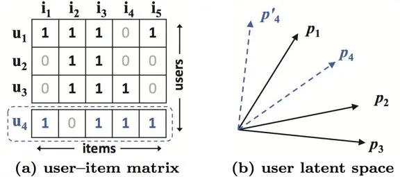 ,这意味着用户u4与用户u1最相似,其次是u3和u2。但是,在(b)中的潜在空间中,如果将p4靠近p1,会使得p4更靠近p2而不是p3,带来排序的损失。