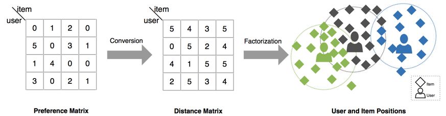 其主要有两个步骤:1. 将偏好矩阵(评分或交互)通过公式1转化为距离矩阵;2. 将距离矩阵分解为一个度量向量空间中的用户和物品坐标。