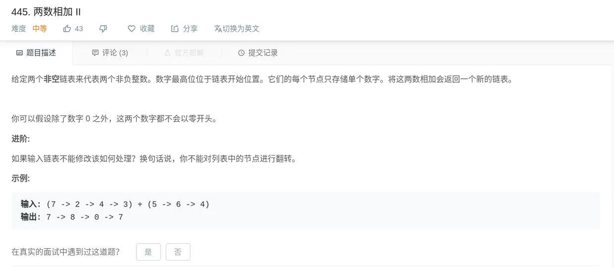 在 LeetCode 206——反转链表 和 LeetCode 2——两数相加 的基础上,先对两个链表进行反转,然后求出和后再进行反转即可。