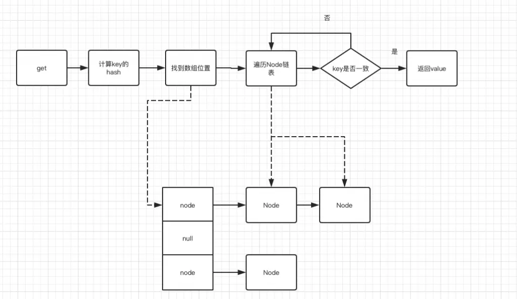 3、如果数组位置有Node节点,则遍历这个Node节点的链表,当且仅当key以及hash都一样的时候,则认为找到了,然后返回value值