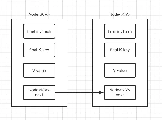 每个节点包含key的hash值、key、value以及指向下一个节点的指针。key的hash值和key在初始化node后就不能变,value可以改变。不同的key由不同的hash值,但是映射到容量有限的数组中时,可能映射到同一个位置,这时候就发送了hash冲突,这就像取模运算,3 mod 2 和 5 mod 2的结果是一样的,但是3不等于5。对于冲突的数据,通过头部插入的方式形成一张链表,从而解决冲突。
