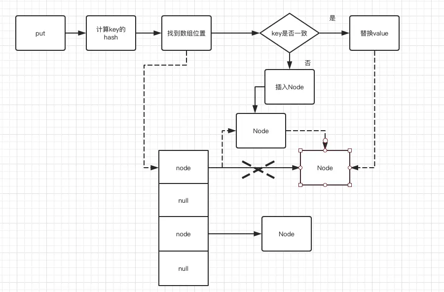 4、如果冲突,判断已存在的Node节点的key值以及hash值和put的是否一样,如果一样,就用新值替换旧值,如果不一样,则new一个Node节点插入到头部,并将Node节点的next指向已存在的节点。