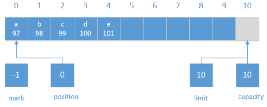| mark | 标记,指一个备忘位置,调用mark()来设定mark=position,调用reset()来设定postion=mark,标记未设定前是未定义的 |