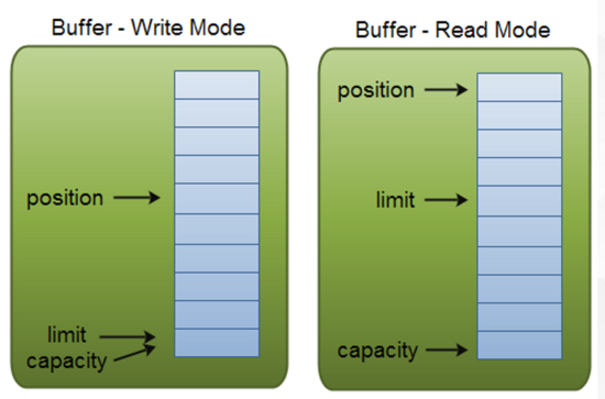 Buffer是固定大小的数据的容器,其作用是一个存储器,或者分段运输区,在这里数据可被存储并在之后用于检索。缓冲区的工作与通道紧密联系,待传递出去的数据被置于一个缓冲区,被传送到通道;待传回的缓冲区的传输,一个通道将数据放置在所提供的缓冲区中。这种在协同对象之间进行的缓冲区数据传递是高效数据处理的关键。