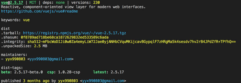 如果您要查看 vue 这个包的信息,会执行npm view vue,其实您可以执行它的简写:npm v vue