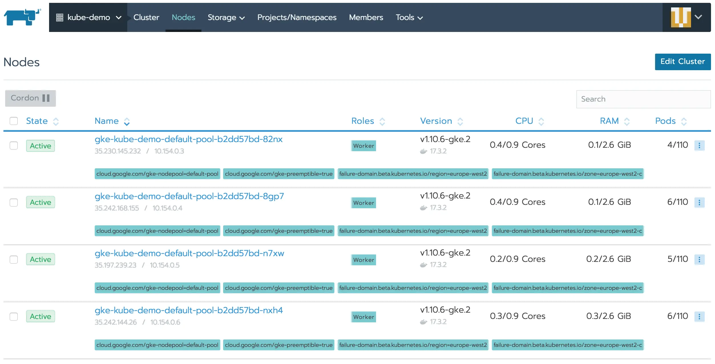 在那里,您还可以看到已从Kubernetes集群部署到每个节点的pod的数量。这些pod由Kubernetes和Rancher内部系统使用。通常情况下你不需要处理那些。